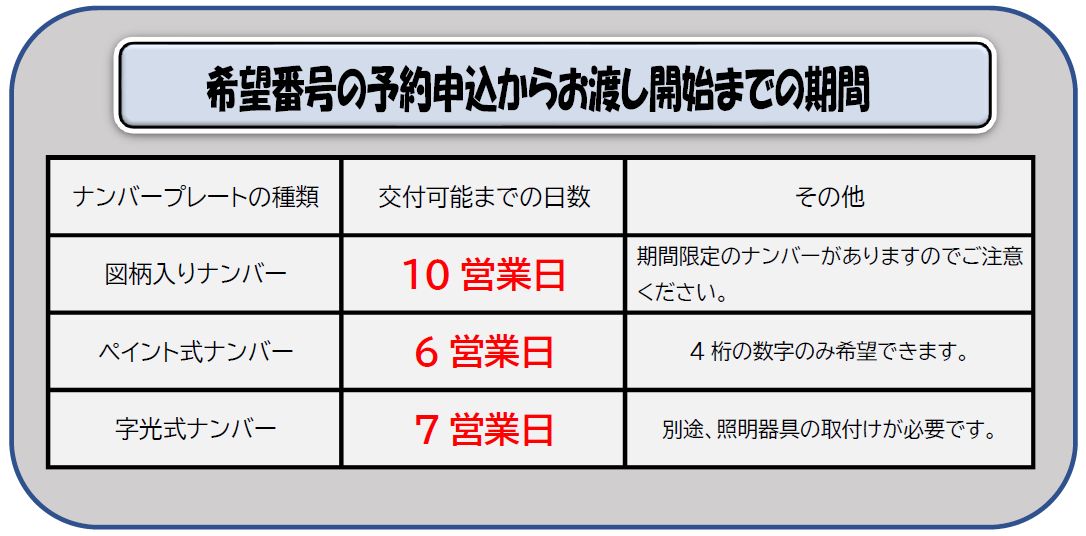 ※希望ナンバーの交付手数料の入金後はいかなる理由があっても返金出来ません。 |